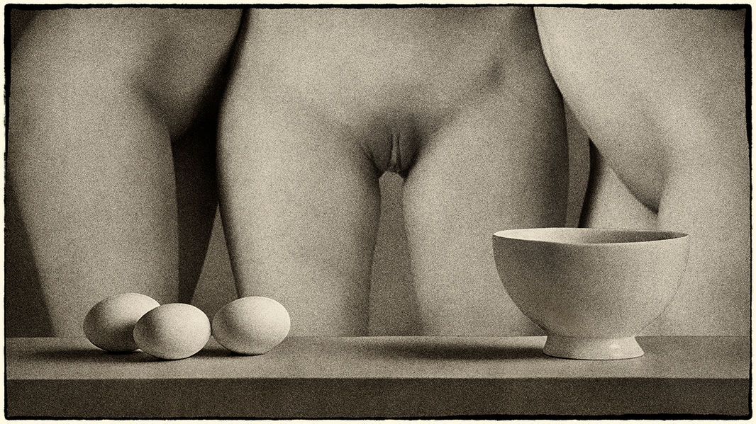 Les éléments inanimés, tels que les œufs et le bol, ne sont pas de simples objets : ils symbolisent la dualité de la vie. Les œufs, métaphores de la création, de la fertilité et de la fragilité, représentent le potentiel de vie qui se tient en équilibre précaire. Leur présence rappelle la délicatesse de chaque existence et la beauté éphémère de ce qui est en gestation. Quant au bol, avec sa forme ouverte et accueillante, il évoque le contenant de l’expérience humaine, le vide à remplir par la création, les émotions et les expériences. Ensemble, ils deviennent un contraste visuel et poétique avec le corps féminin, suggérant un dialogue entre la nature et la culture, la procréation et la contemplation.